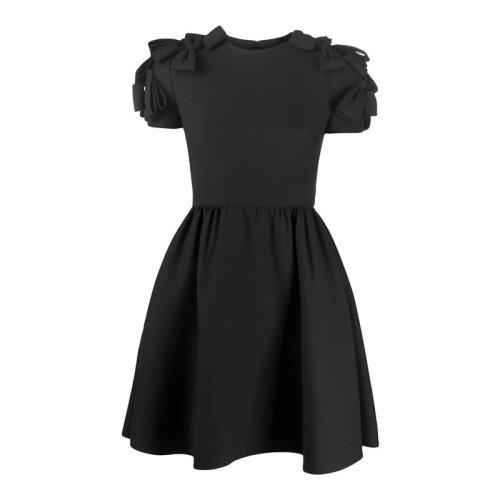 Valentino/华伦天奴 女士黑色初剪羊毛真丝混纺蝴蝶结缀饰圆领短袖全裙式连衣裙 UB3VAT91-1CF-0NO