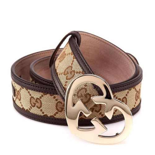 GUCCI/古驰 男女同款 中性棕色帆布配牛皮滚边经典金色双G心形扣头腰带皮带 245856-FAFXG-9643