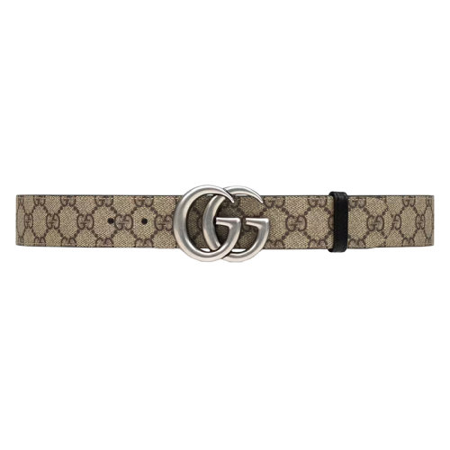 GUCCI/古驰 22年春夏新款 男士米色/乌木色老花印花帆布银色双G带扣双面腰带37毫米62705592TIN9769