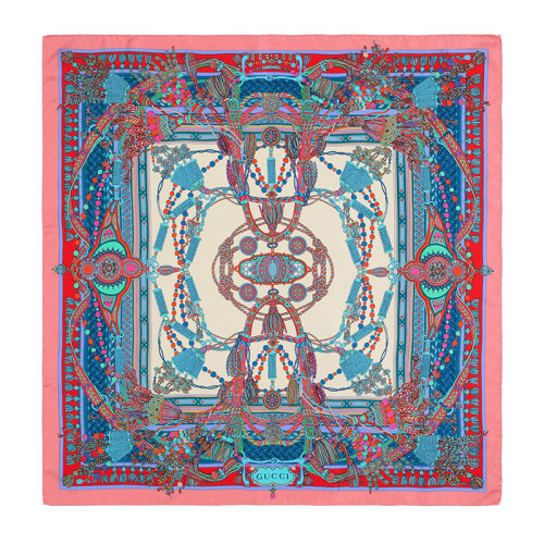 GUCCI/古驰 女士粉色和红色链印花流苏真丝围巾6474813G0015874
