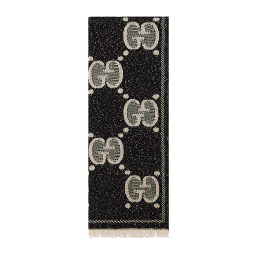 GUCCI/古驰新款 女士黑色和象牙白色GG羊毛金银丝线提花围巾5989933GC151078