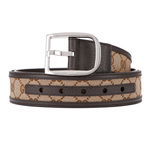 GUCCI/古驰 男士腰带卡其色帆布深咖色配皮银色扣腰带