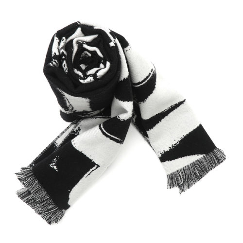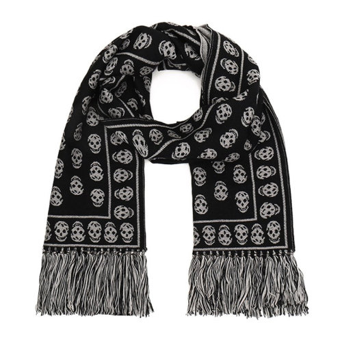 Alexander McQueen/亚历山大麦昆 中性黑白拼色羊毛骷髅头印花流苏滚边双面长款披肩围脖围巾 358351-4200Q-1078