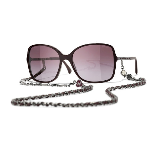 Chanel/香奈儿 22年春夏新款 女士渐变紫色镜片酒红色/深银色醋酯纤维镜框饰金属和小牛皮链条方框太阳眼镜墨镜A40911X06074S4611
