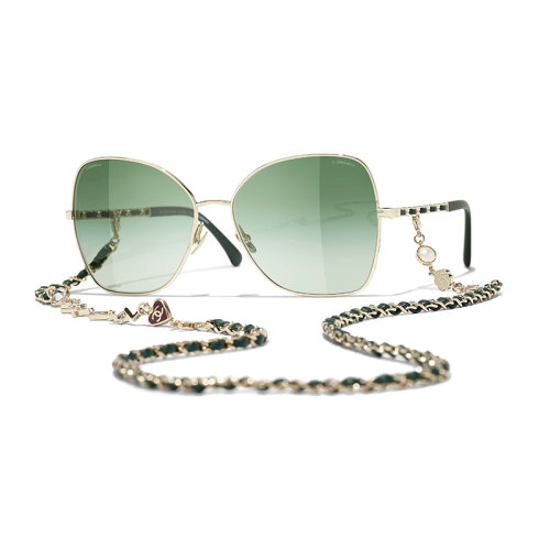 Chanel/香奈儿 22年春夏新款 女士渐变绿色镜片金色/绿色金属与小牛皮镜框饰链条蝴蝶形太阳眼镜墨镜A71446X27388L6813