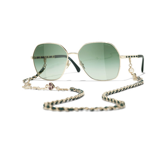 Chanel/香奈儿 22年春夏新款 女士渐变绿色镜片金色/绿色金属与小牛皮镜框饰链条方框太阳眼镜墨镜A71447X27388L6813