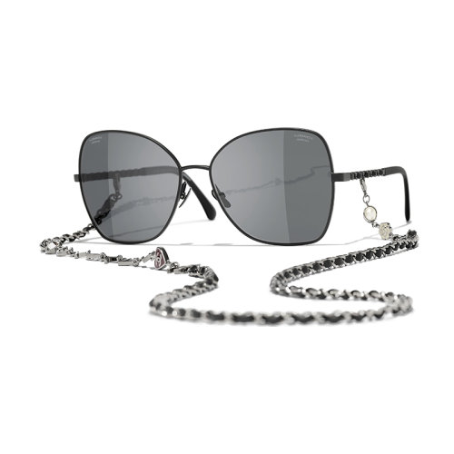 Chanel/香奈儿 22年春夏新款 女士灰色镜片黑色金属与小牛皮镜框饰链条蝴蝶形太阳眼镜墨镜A71446X27389L1128
