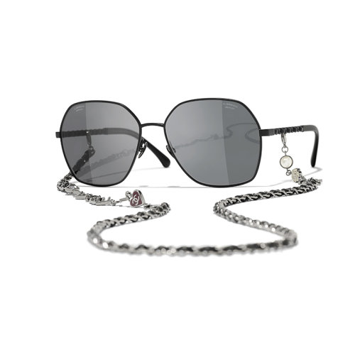 Chanel/香奈儿 22年春夏新款 女士灰色镜片黑色金属与小牛皮镜框饰链条方框太阳眼镜墨镜A71447X27389L1128