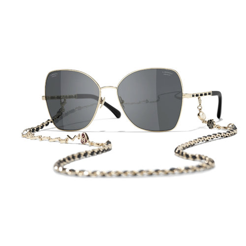 Chanel/香奈儿 22年春夏新款 女士灰色镜片金色/黑色金属与小牛皮镜框饰链条蝴蝶形太阳眼镜墨镜A71446X27389L9528