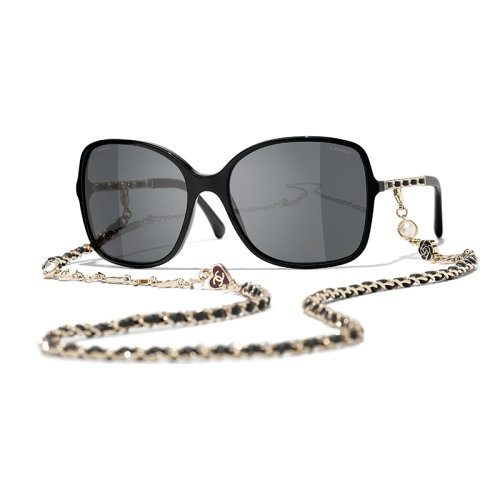 Chanel/香奈儿 22年春夏新款 女士灰色镜片黑色/金色醋酯纤维镜框饰金属和小牛皮链条方框太阳眼镜墨镜A40911X06074S2214