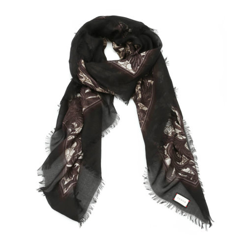 GUCCI/古驰 女士黑色莫代尔真丝混纺大蔓藤花纹末端流苏披肩围巾围脖丝巾方巾 415538-3G856-1079