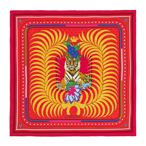 HERMES/爱马仕 女士拼色真丝花饰王者之虎印花手工卷边斜纹方巾丝巾头巾围巾 H983503S 多色可选