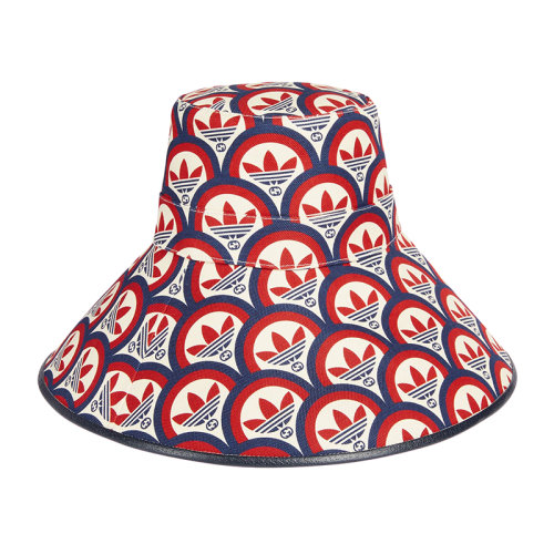 GUCCI/古驰 22年秋冬新款 adidas联名系列 女士蓝色/红色棉麻混纺老花图案宽边帽6964824HAQF6468