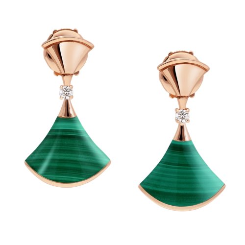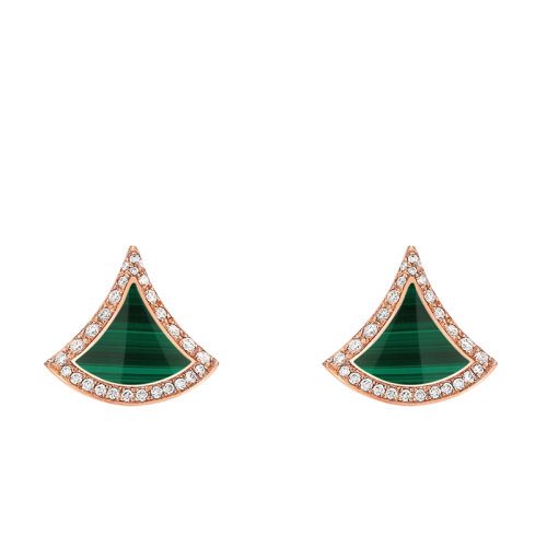 BVLGARI/宝格丽 22新款DIVAS’ DREAM系列 18K金玫瑰金密镶钻石饰边孔雀石精致扇形图案耳钉耳环359018