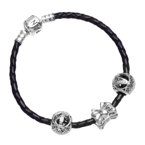 PANDORA/潘多拉 女士925银字母蝴蝶结黑色皮革手链手镯 PAND00097