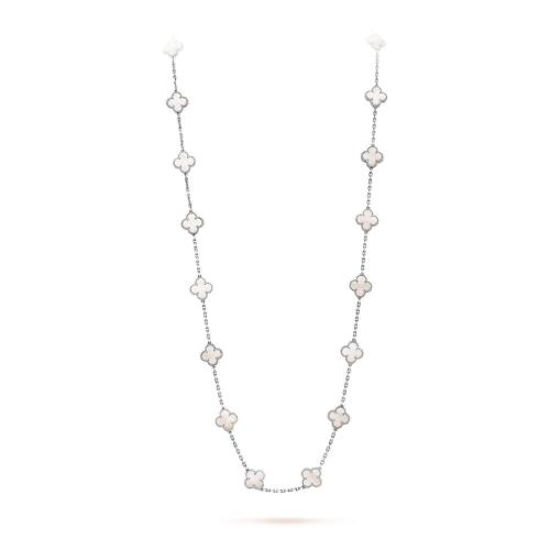 Van Cleef & Arpels/梵克雅宝 经典Magic Alhambra系列 18k金白金白色灰色珍珠母贝玉髓16个四叶草吊坠长项链VCARN19000