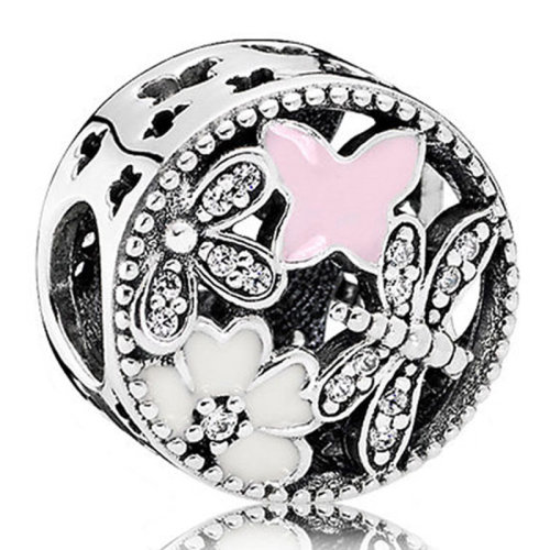 PANDORA/潘多拉 女士粉白拼色925银+锆石珐琅诗花绽放DIY手链珠子串饰串珠 791842ENMX