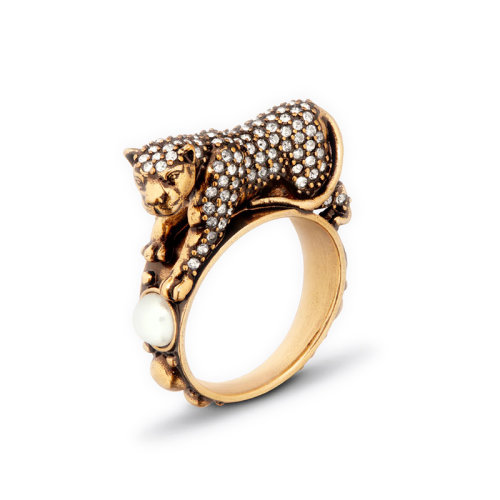 DIOR/迪奥 22新款 女士仿古金色金属白色树脂珠配银色水晶镶嵌老虎戒指R1318WOMCY_D09S