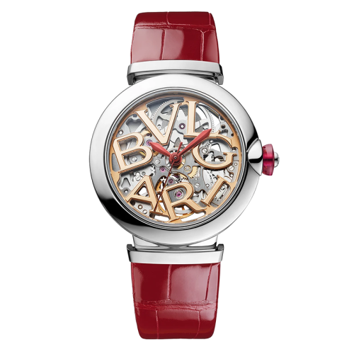BVLGARI/宝格丽 不锈钢表壳 镂空表盘 饰有BVLGARI徽标和红色鳄鱼皮表带 LVCEA镂空表带机械机芯手表 33毫米102879
