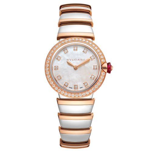 BVLGARI/宝格丽 18k金t玫瑰金表圈 镶有明亮式切割钻石 白色珍珠母贝表盘 钻石时标和不锈钢手镯 LVCEA石英手表 28毫米102475