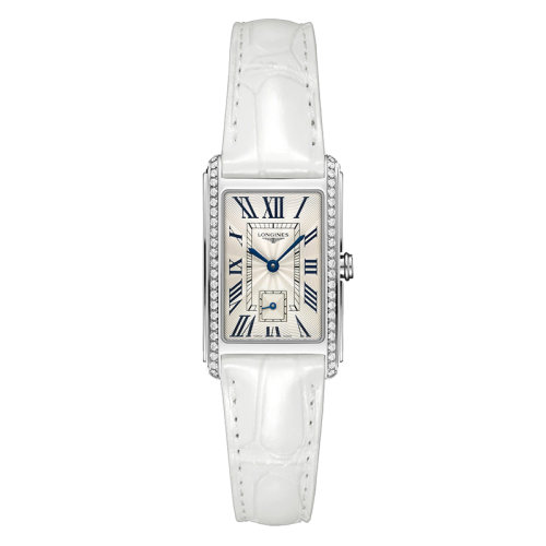 LONGINES/浪琴 黛绰维纳系列 男女同款46颗韦塞尔顿美钻0.552克拉石英机芯长方形银色表盘白色鳄鱼皮表带手表L5.512.0.71.2