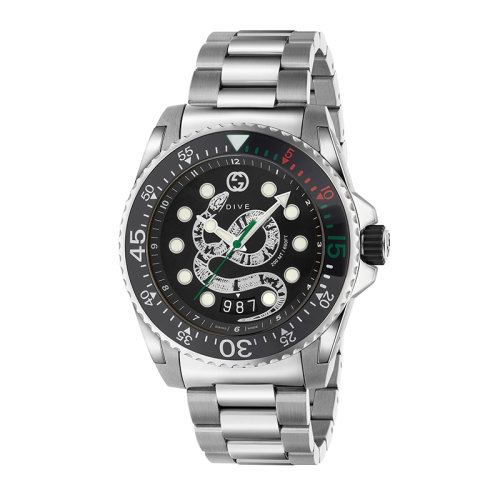 GUCCI/古驰 古驰Gucci Dive系列的潜水表以钢质表壳和黑色表盘配银色蛇纹搭配精钢表链,45毫米