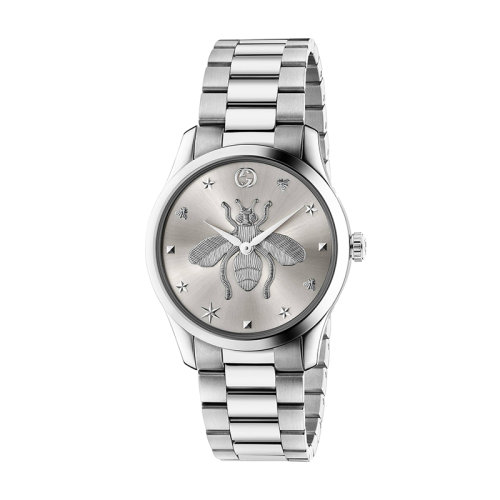 GUCCI/古驰 古驰G-Timeless系列钢质表壳带蜜蜂图案的磨砂银色表盘和精钢表链腕表,38毫米