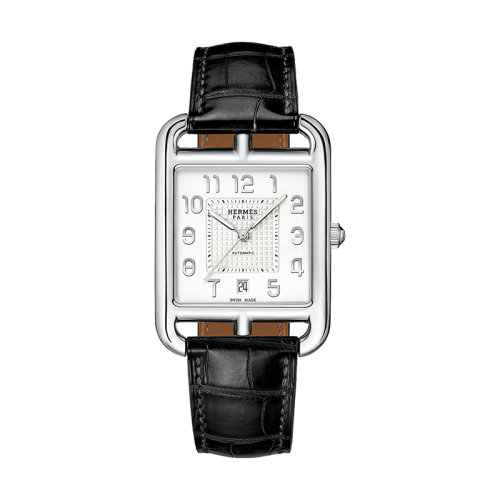 HERMES/爱马仕 Cape Cod系列 男士自动机械乳白色银色表盘精钢表壳和哑光黑色鳄鱼皮表带腕表33毫米W055348WW00