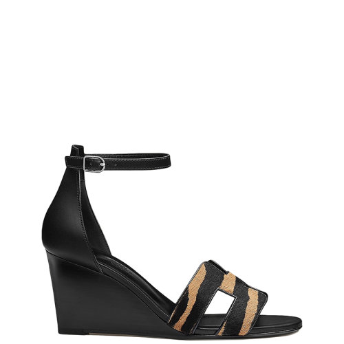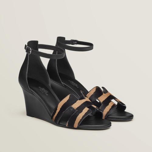 HERMES/爱马仕 22年春夏新款 Legend系列 女士黑色/米色小牛皮H标志动物纹坡跟凉鞋H212190Z03360