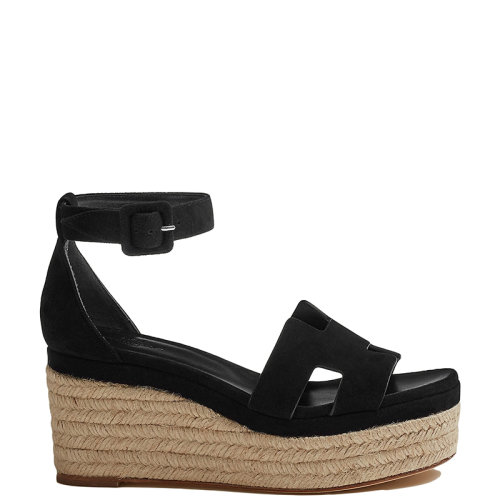 HERMES/爱马仕 22年秋冬新款 Elda系列 女士黑色山羊绒面革坡跟草编鞋凉鞋H222136Z02390