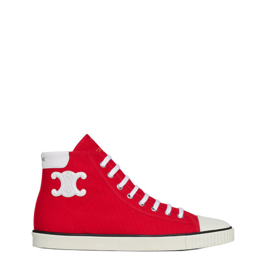 CELINE/赛琳 22年早春新款 BLANK系列 女士亮红色织物/牛皮革侧面TRIOMPHE贴饰高帮运动鞋帆布鞋343202006C.27BR