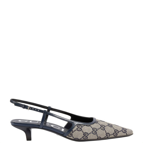 GUCCI/古驰 22年春夏新款 女士米色/蓝色老花帆布后系带浅口鞋低跟鞋693210KY9804061
