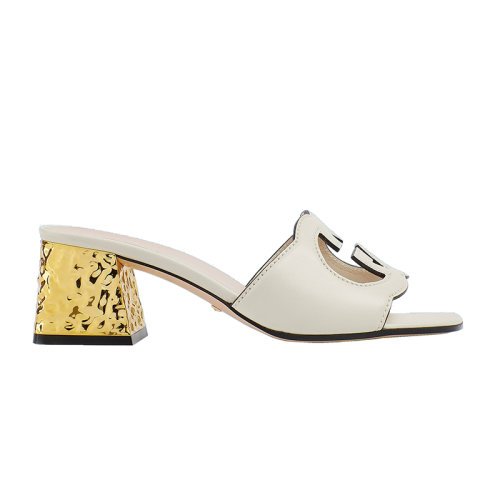 GUCCI/古驰 22秋冬新款 女士白色皮革锤纹效果鞋跟互扣式双G镂空中跟拖鞋694450US0009022