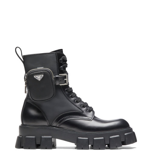 PRADA/普拉达 22年新款 Monolith系列 男士黑色亮面皮革和尼龙材质饰可拆卸小袋军旅风短靴马丁靴2UE007_3LFR_F0002_F_D002
