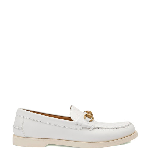 GUCCI/古驰 22年春夏新款 爱的进行曲系列 男士白色皮革拼大老花帆布马衔扣乐福鞋695049UPG509000
