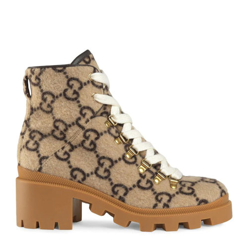 GUCCI/古驰 女士卡其色织物皮革拼接GG印花红绿条绑带系带低跟马丁靴短筒靴女靴 578585-G38H0-9772