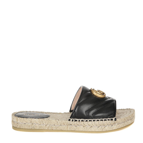 GUCCI/古驰 新款女士黑色皮革饰边双G经典帆布麻底凉拖620120KQWM09765